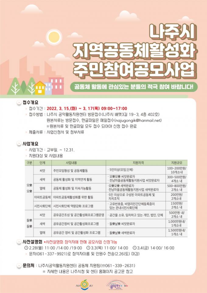 ¼³¸íȸ¿¡ Âü¿©ÇÒ ÁֹΡ¤°øµ¿Ã¼´Â ³ªÁֽðøÀÍȰµ¿Áö¿ø¼¾ÅÍ(¢Î061-337-9921)¿¡ Àοø¼ö¿Í Âü¼®ÀϽø¦ ¹®ÀÚ·Î Àü¼ÛÇÏ¸é µÈ´Ù. °øÀÍȰµ¿Áö¿ø¼¾ÅÍ´Â »çÀü¼³¸íȸ ÀÌÈÄ »ç¾÷°èȹÄÁ¼³ÆÃ, ½É»ç µîÀ» °ÅÃÄ ¿À´Â 4¿ù ÃÊ »ç¾÷ ´ë»óÀÚ¸¦ ¼±Á¤ÇÒ ¿¹Á¤ÀÌ´Ù.