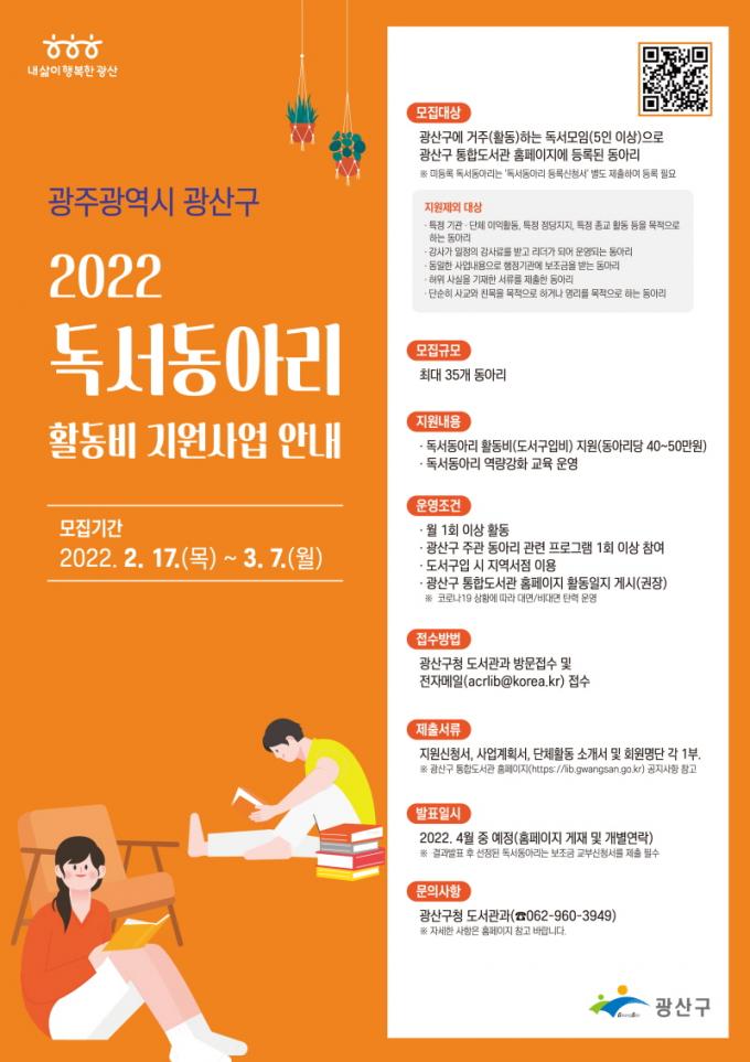 ±¤»ê±¸¿¡ °ÅÁÖ ¶Ç´Â Ȱµ¿Çϰí, 5ÀÎ ÀÌ»óÀ¸·Î ±¸¼ºµÇ¾úÀ¸¸ç, ±¤»ê±¸ ÅëÇÕµµ¼°ü ȨÆäÀÌÁö¿¡ µî·ÏµÈ µ¿¾Æ¸®°¡ Áö¿ø ´ë»óÀÌ´Ù. ¹Ìµî·Ï ȤÀº ½Å±Ô µ¶¼µ¿¾Æ¸®ÀÇ °æ¿ì µ¶¼µ¿¾Æ¸® µî·Ï½Åû¼¸¦ º°µµ Á¦ÃâÇÏ¿© µî·ÏÇÏ¸é ½ÅûÇÒ ¼ö ÀÖ´Ù. ´ÙÀ½ ´Þ 7ÀϱîÁö ½Åû¼¿Í ±¸ºñ¼·ù¸¦ ±¤»ê±¸ µµ¼°ü°ú¿¡ ¹æ¹®Á¢¼ö, ¿ìÆíÁ¢¼ö, ÀüÀÚ¿ìÆí(acrlib@korea.kr) Áß ¼±ÅÃÇÏ¿© ½ÅûÇϸé Á¢¼öµÈ´Ù.