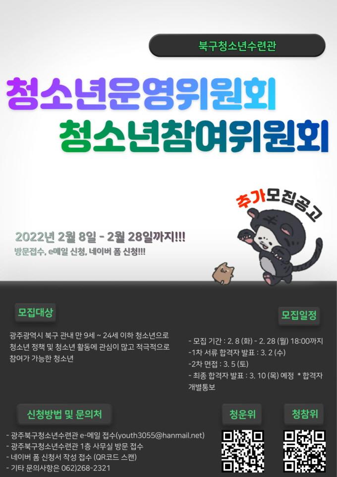¸ðÁýÀº ¿À´Â 2¿ù 28ÀÏ(¿ù)±îÁö û¼Ò³â¿î¿µÀ§¿øÈ¸´Â 15¸í ³»¿Ü, û¼Ò³âÂü¿©À§¿øÈ¸´Â 20¸í ³»¿Ü·Î ±¤Áֺϱ¸ °ÅÁÖÀÚ ¶Ç´Â ±¤Áֺϱ¸ ¼ÒÀç Çб³ ÀçÇÐÁßÀÎ ¸¸ 9¼¼~24¼¼ÀÌÇÏ Ã»¼Ò³âÀ̶ó¸é ´©±¸³ª ½ÅûÇÒ ¼ö ÀÖ´Ù.
