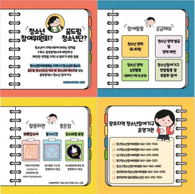 ±¤ÁÖ±¤¿ª½Ã û¼Ò³â Âü¿©±â±¸(µ¿¡¤¼¡¤³²¡¤ºÏ¡¤±¤»ê±¸ û¼Ò³âÂü¿©À§¿øÈ¸, ±¤ÁÖ±¤¿ª½Ãû¼Ò³âÂü¿©À§¿øÈ¸, ±¤ÁÖ±¤¿ª½Ã²Þµå¸²Ã»¼Ò³â´Ü)´Â û¼Ò³âÀÌ Á÷Á¢ Á¤Ã¥À» ¸ð´ÏÅ͸µ ¹× û¼Ò³âµé¿¡°Ô ÇÊ¿äÇÑ Á¤Ã¥Á¦¾È Ȱµ¿À» ¿î¿µÇϸç, Áö¿ª ³» û¼Ò³âÂü¿©±â±¸¿Í ¿¬ÇÕȰµ¿À» ÅëÇØ Á¤Ã¥À» °øÀ¯Çϰí Åä·Ðȸ ¹× Á¤Ã¥Á¦¾È Ä·ÆäÀΠȰµ¿À» ÁøÇàÇÑ´Ù.